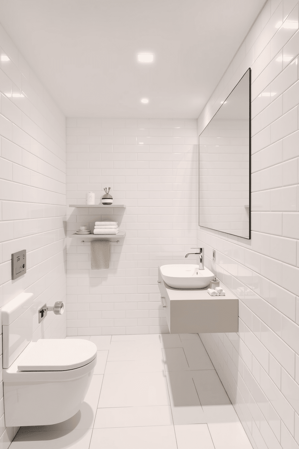 A contemporary basement washroom featuring bright white tiles that create a clean and spacious atmosphere. The space includes a sleek floating vanity with a modern sink, complemented by stylish fixtures and ample lighting.
