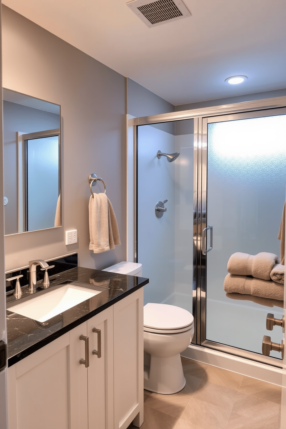 Basement Washroom Design Ideas. Envision a modern basement washroom featuring sleek, dark cabinetry paired with a light marble countertop, creating a striking contrast. The space is illuminated by recessed lighting and a stylish pendant light, enhancing the contemporary feel while providing functional brightness.