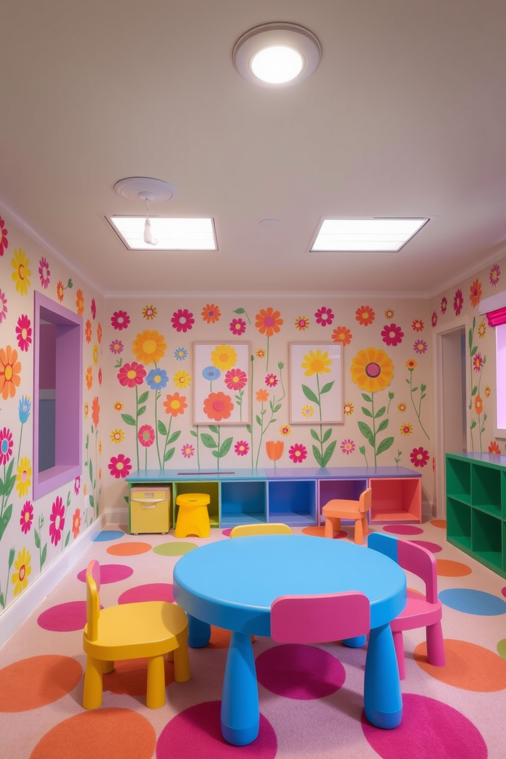 A vibrant playroom filled with energy and creativity. The walls are adorned with cheerful floral patterns in bright colors, creating a joyful atmosphere for children.