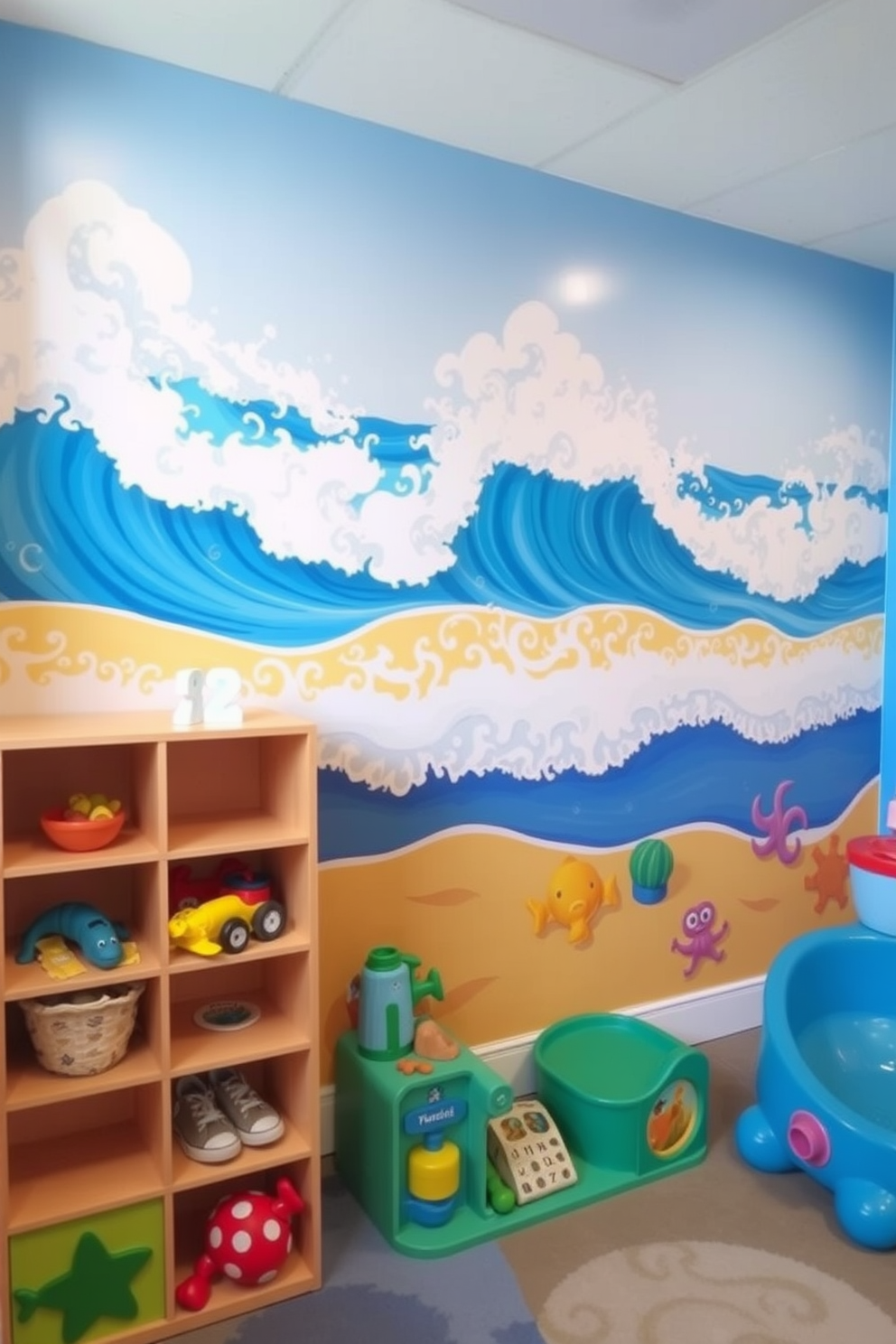A vibrant mural depicting ocean waves crashing against a sandy beach fills the playroom wall. The colors are bright and inviting, with shades of blue and golden yellow that create a cheerful and playful atmosphere.