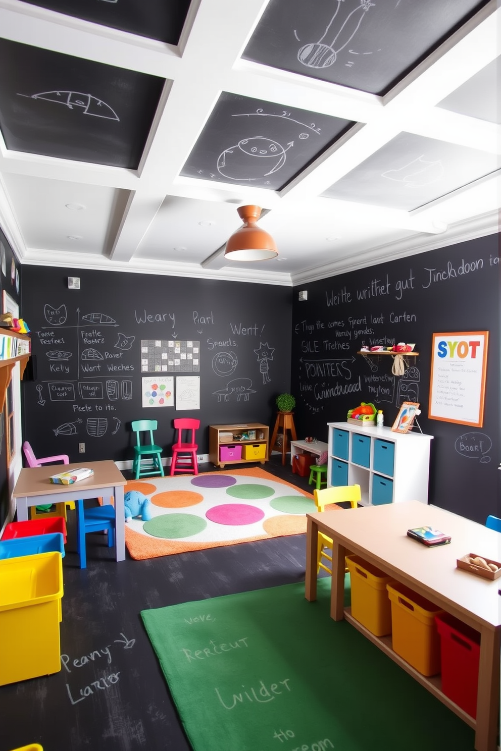 The chalkboard walls provide a versatile canvas for games, drawings, and educational activities. Brightly colored storage bins and soft rugs enhance the playful atmosphere, making it an ideal space for learning and play.