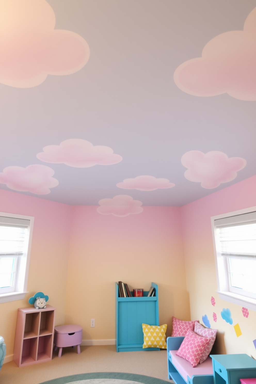 A whimsical playroom featuring soft pastel clouds painted across the ceiling and walls, creating a dreamy atmosphere. The clouds are in shades of pink, blue, and lavender, providing a serene backdrop for playful activities.