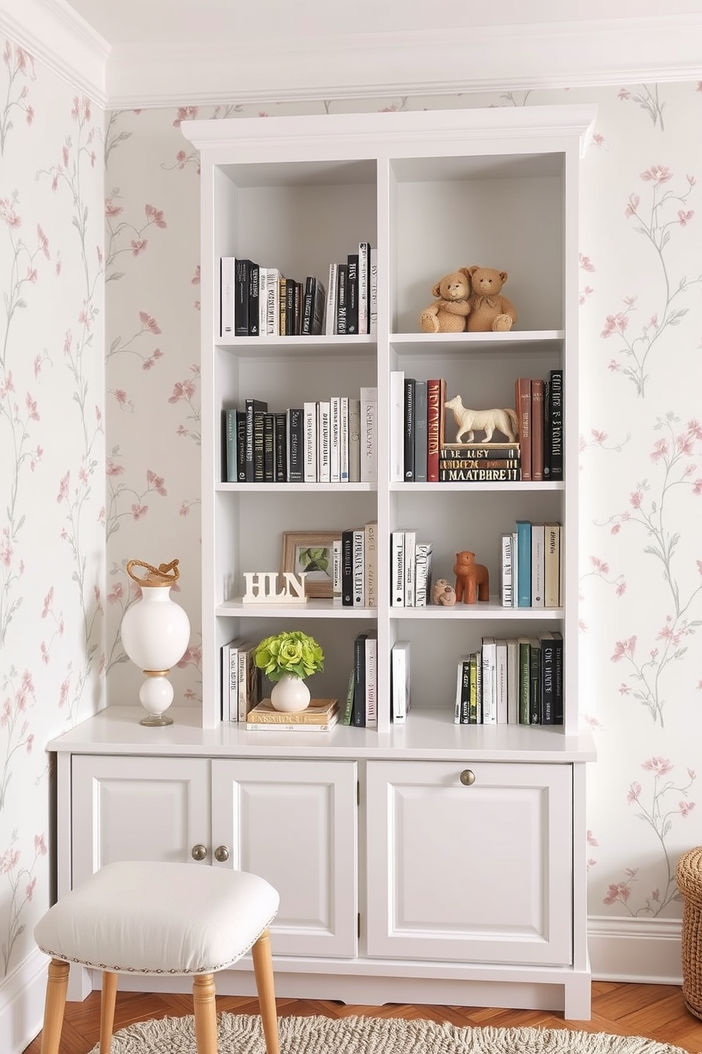 Elegant floral patterns in soft tones. The walls are adorned with delicate wallpaper featuring subtle floral designs in pastel colors, creating a serene atmosphere.