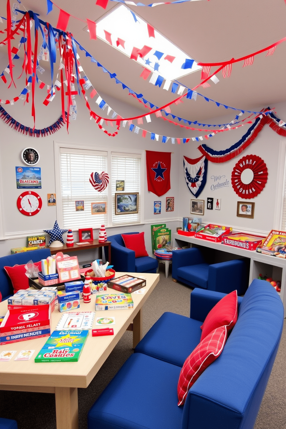 A vibrant game room showcasing an Independence Day themed board game display. The walls are adorned with red white and blue decorations while a large table is set with various patriotic board games and snacks.