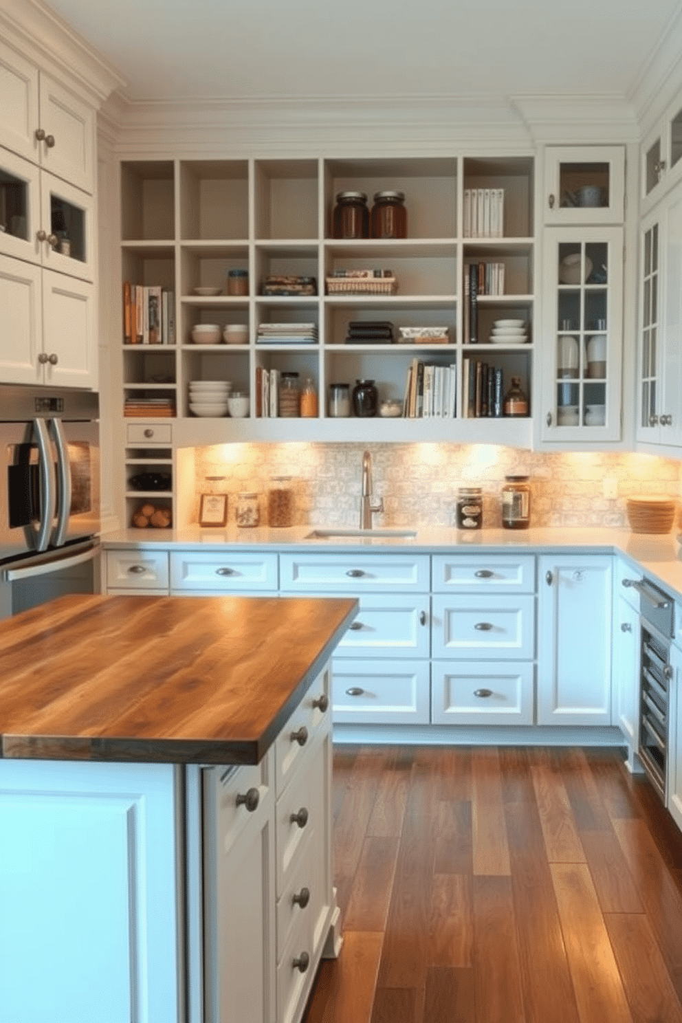 A spacious pantry island featuring a large, polished wood countertop that provides ample workspace for meal prep and organization. Surrounding the island are custom cabinetry in a soft white finish, with open shelving above displaying neatly arranged jars and cookbooks.