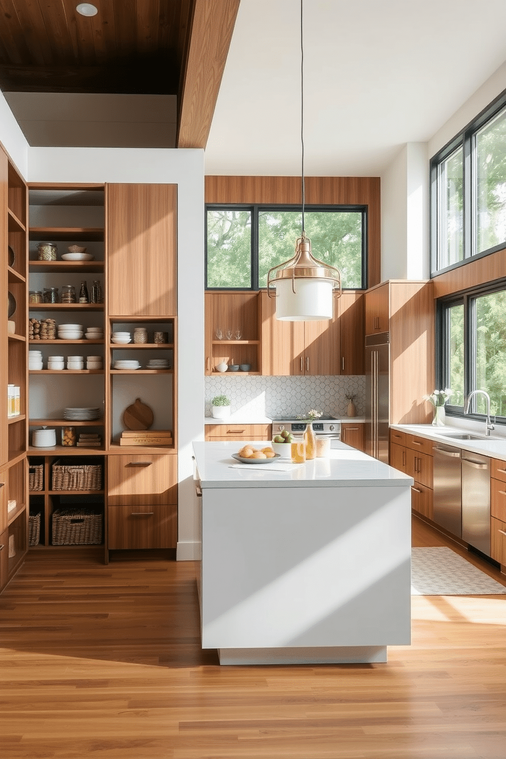 Natural light floods the space through large windows, highlighting the warm wood tones and white accents. A stylish pendant light hangs above the island, creating an inviting atmosphere for cooking and entertaining.