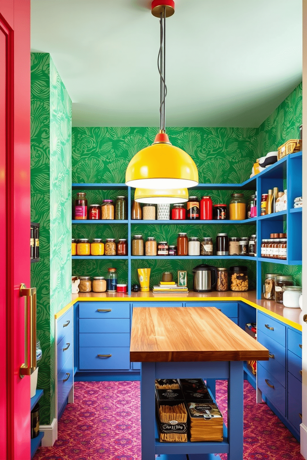The pantry includes a central island for additional storage and workspace, topped with a sleek wooden countertop. Bright pendant lights hang above, illuminating the cheerful space and highlighting the colorful decor.