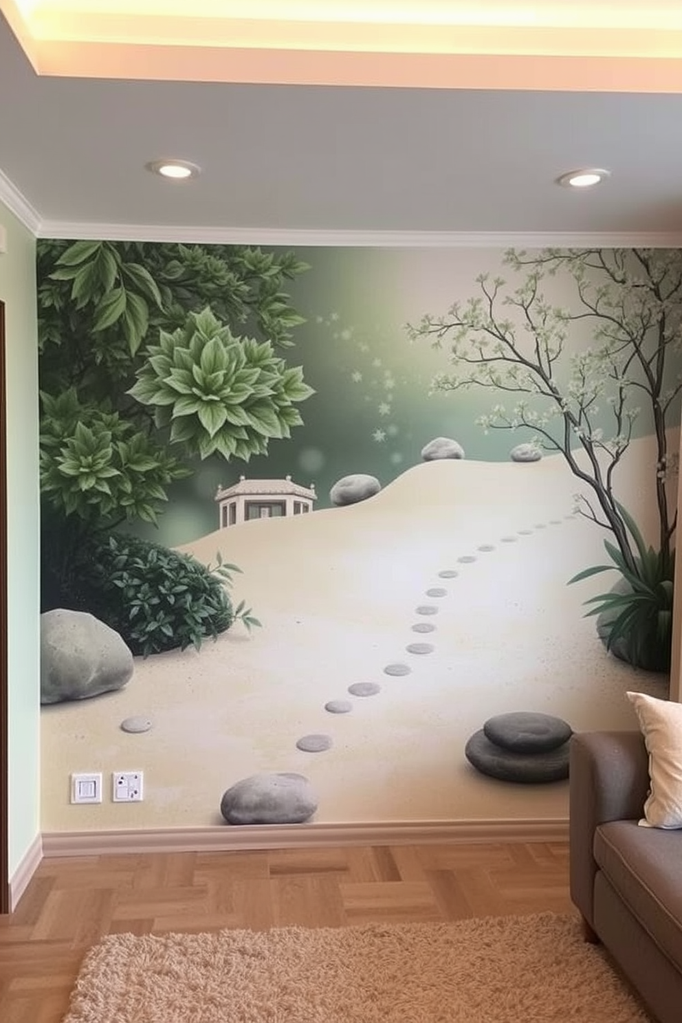A serene zen garden mural creates a calming atmosphere that invites tranquility into the space. Soft hues of green and beige blend harmoniously, depicting gentle raked sand patterns and delicate stones.