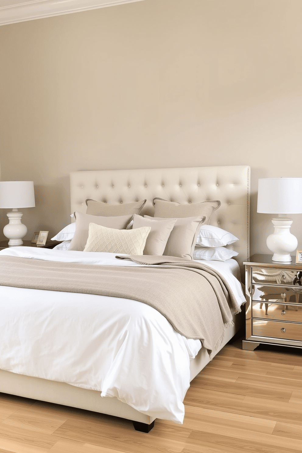 The walls are painted in a soft beige tone, creating a sense of calm and warmth, while the floor features light hardwood. A pair of matching nightstands flank the bed, each adorned with elegant ceramic lamps and minimalist decor accents.