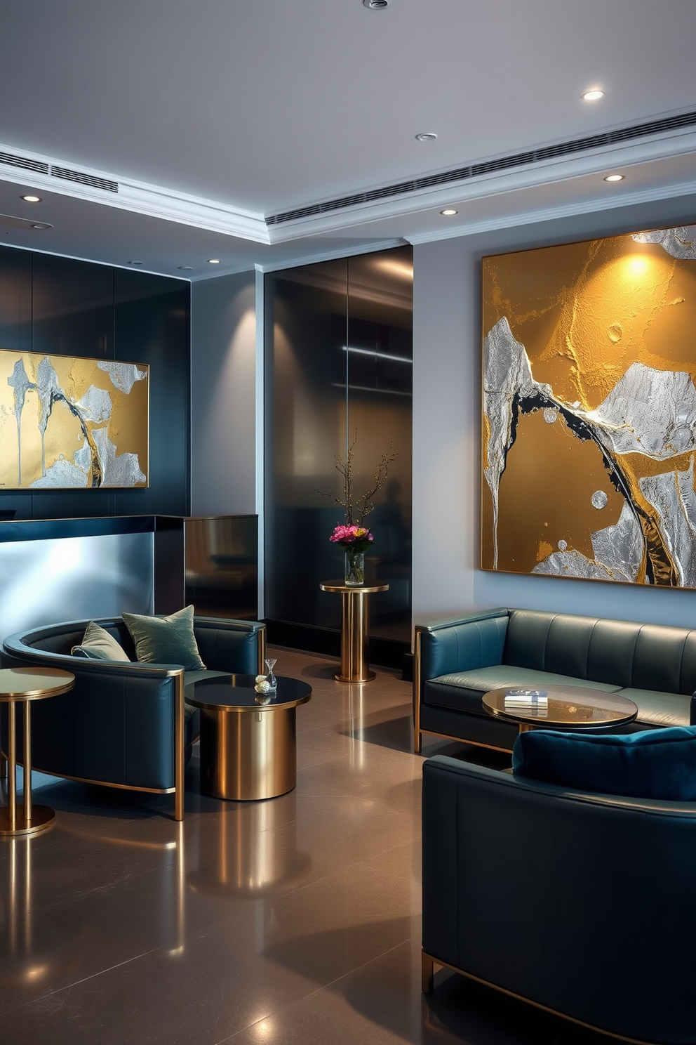 A reception area designed with metallic finishes exudes a touch of glamour. The walls are adorned with large abstract paintings that incorporate gold and silver tones, creating a striking focal point.