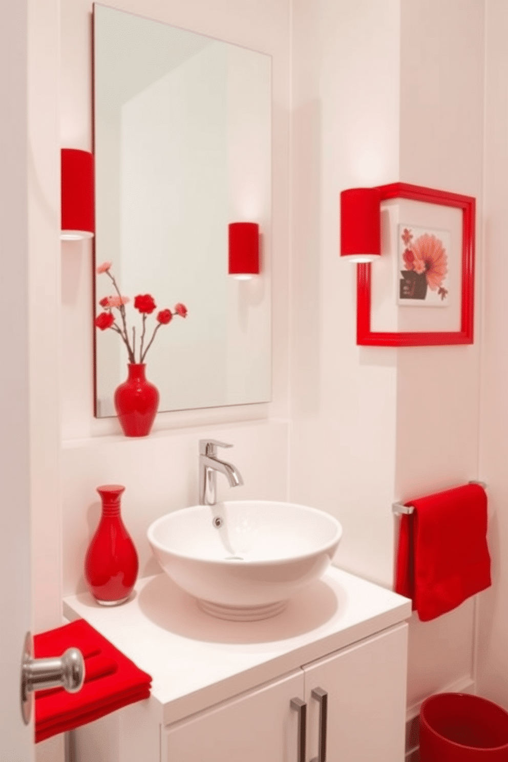 A vibrant powder room featuring bright red accessories that create a cheerful and lively atmosphere. The walls are painted in a soft white, allowing the red accents, such as a bold vanity, towels, and decorative items, to stand out beautifully.