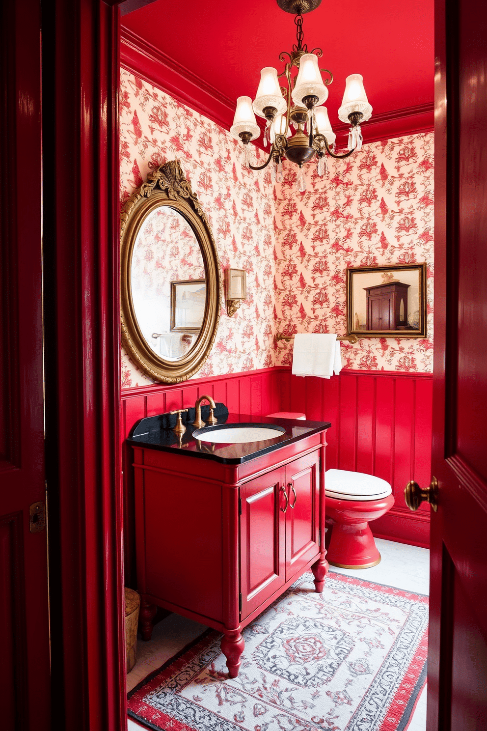 A vintage red powder room featuring classic red furniture that exudes a retro vibe. The walls are adorned with playful wallpaper, and a stylish chandelier hangs from the ceiling, adding a touch of elegance.