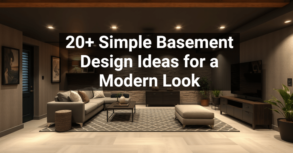 Simple basement design ideas that maximize space and functionality, incorporating a comfortable seating area with a sectional sofa and a sleek coffee table. The walls are painted in a light gray tone, complemented by warm accent lighting and a stylish area rug to create an inviting atmosphere.