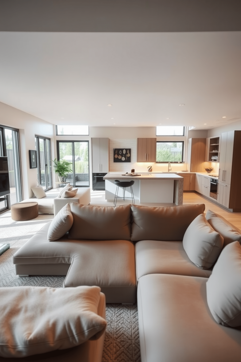 Incorporate a cozy seating area with a plush sectional sofa and a minimalist coffee table. The walls are painted in a light gray hue, enhancing the brightness of the recessed lighting while adding a touch of sophistication.