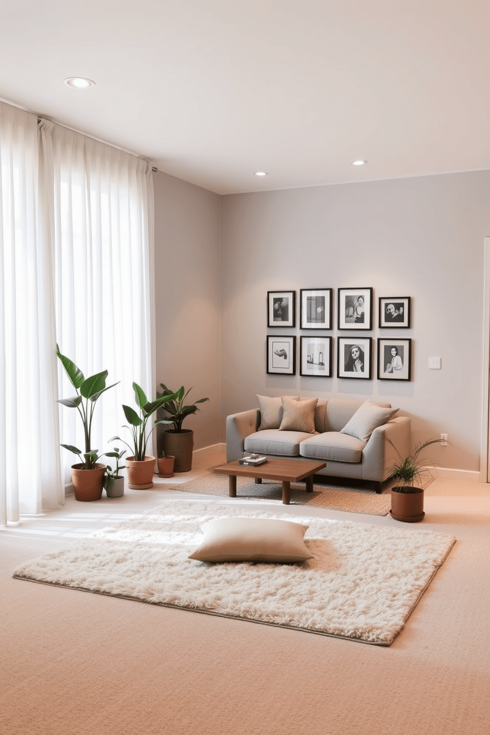 Simple basement design ideas incorporating a cozy lounge area with a sectional sofa and a coffee table. The walls are painted in a light gray, and accent lighting highlights a gallery of framed artwork, creating an inviting ambiance.