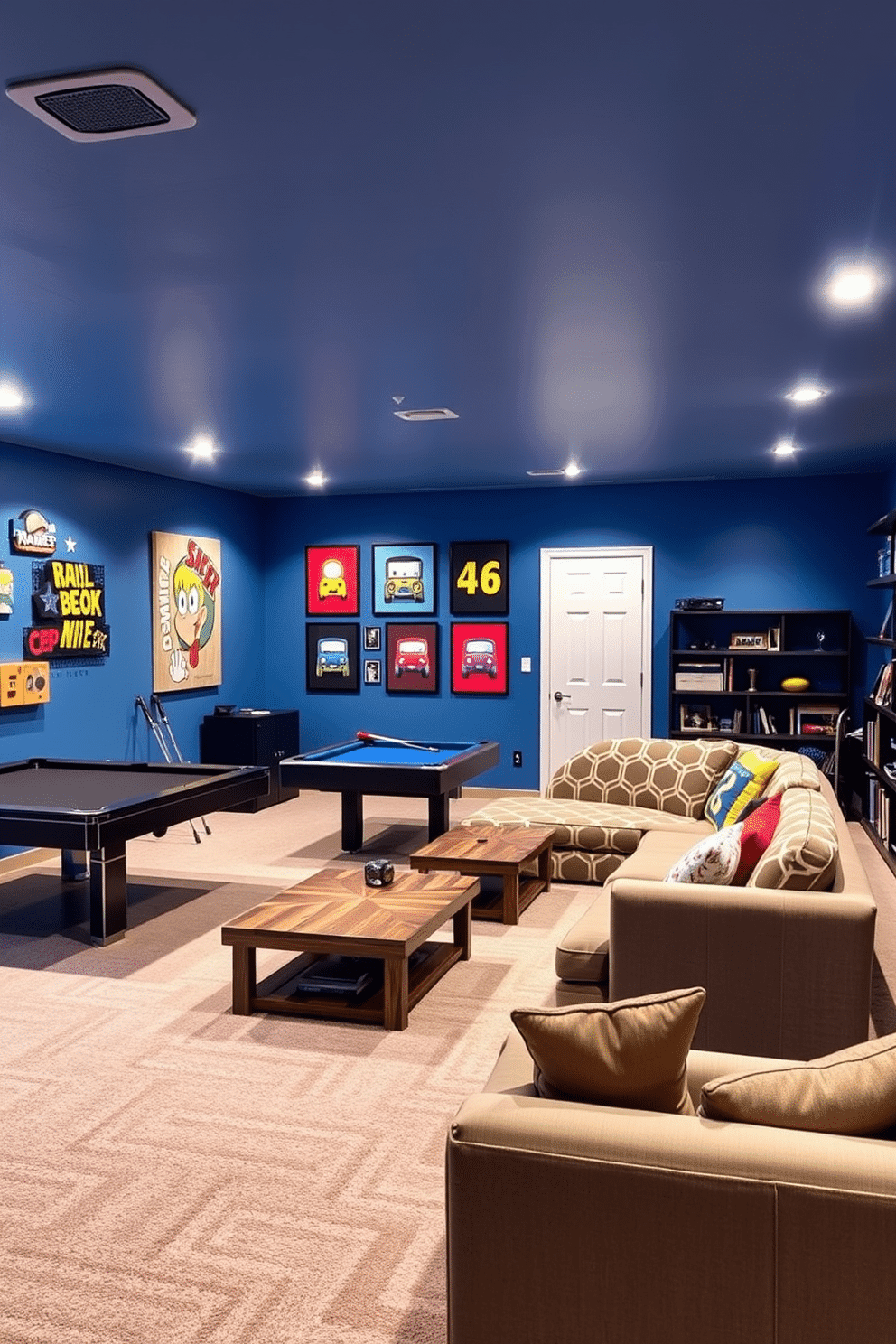 A vibrant game room filled with playful decor awaits. The walls are painted in a bright blue, and colorful artwork featuring retro video games adorns the space.