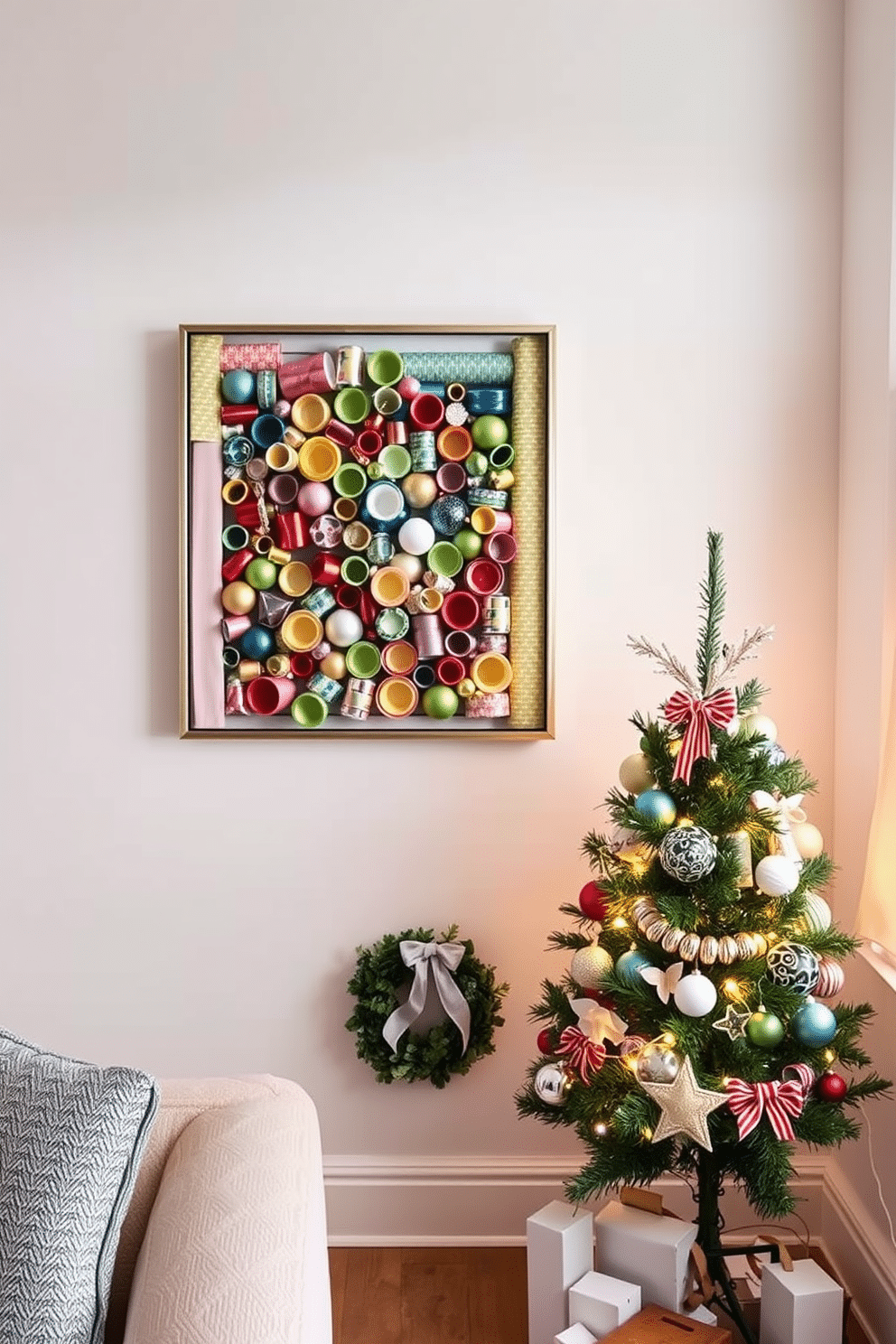 For small space Christmas decorating, a compact tree adorned with twinkling lights and minimalist ornaments sits in the corner, maximizing the use of vertical space. Surrounding the tree, a collection of carefully arranged holiday-themed decor items, such as wreaths and garlands, adds warmth and charm without overwhelming the area.
