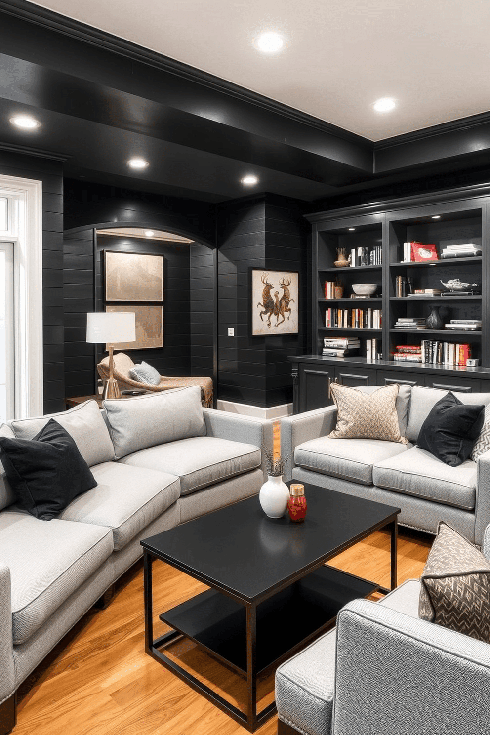 The black basement design incorporates plush seating arrangements with modern furniture, creating an inviting atmosphere. Rich textures, such as a soft area rug and stylish wall art, add warmth to the space while maintaining a contemporary edge.