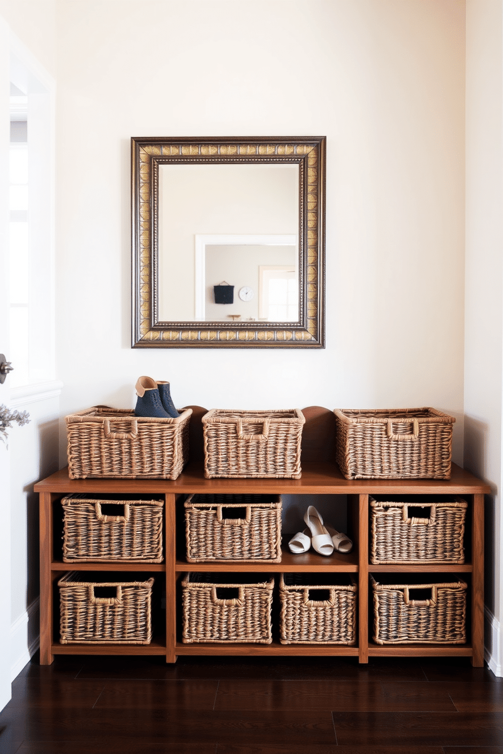 A stylish foyer entryway featuring woven baskets for shoe storage. The baskets are neatly arranged on a wooden bench, providing both functionality and a warm, inviting aesthetic.
