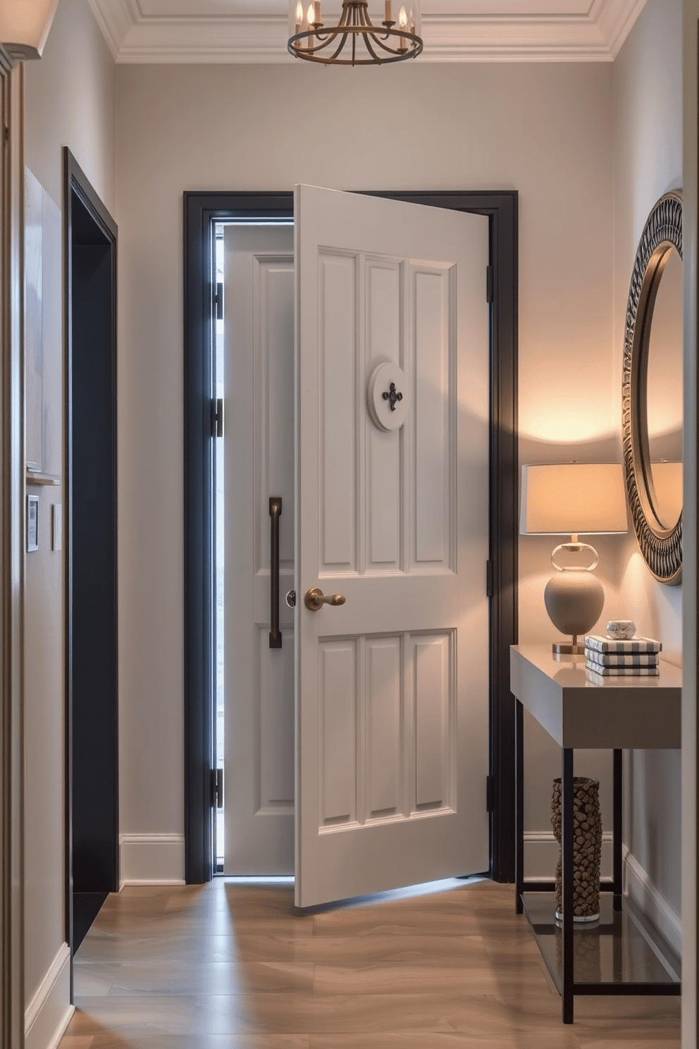 Surrounding the door, a minimalist console table showcases decorative items and a statement mirror. Soft lighting illuminates the area, creating a warm and inviting atmosphere that welcomes guests.