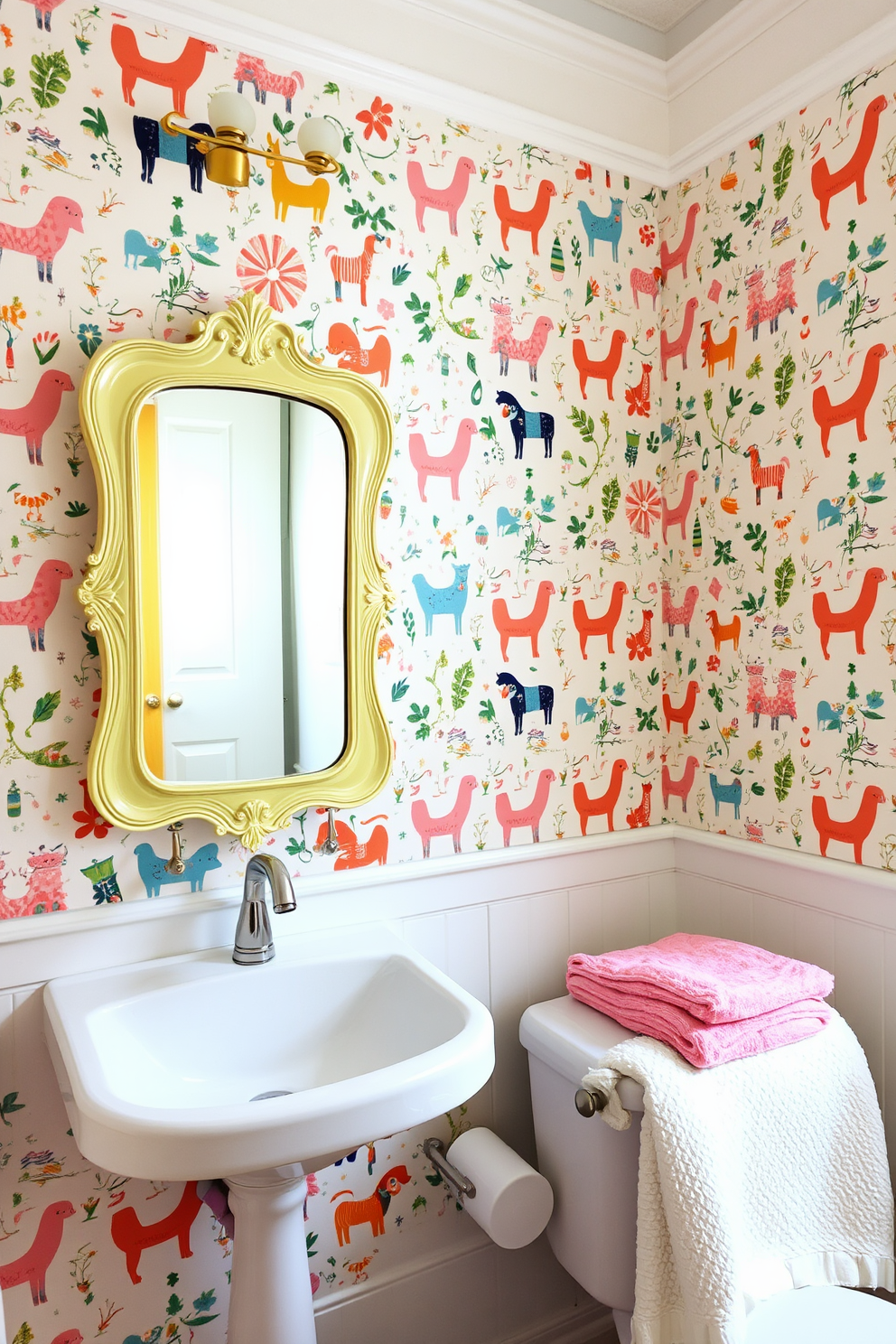 Complementing the wallpaper, soft pastel accents in the accessories enhance the overall playful theme. A vintage-style mirror with a quirky frame adds character, while fluffy towels in coordinating colors invite comfort and warmth.