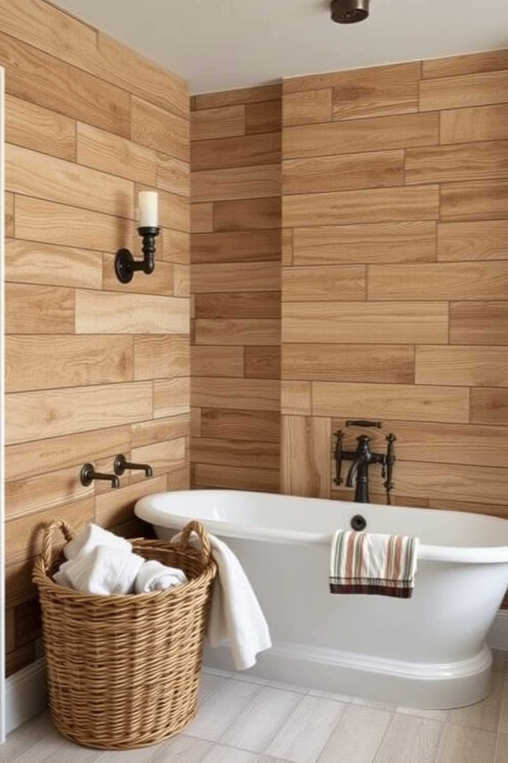 Vintage-inspired fixtures complement the rustic aesthetic, with a freestanding tub nestled against the wall. A woven basket filled with plush towels sits nearby, enhancing the inviting atmosphere.