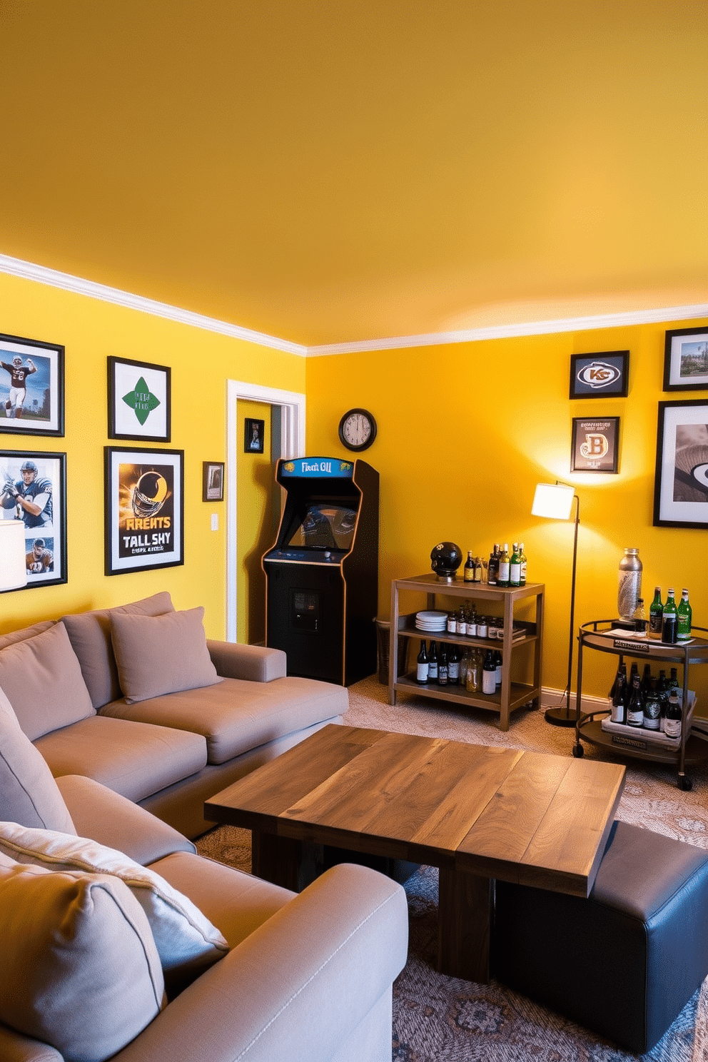A vibrant man cave designed around bright yellow sports team colors. The walls are painted in a bold yellow hue, adorned with framed jerseys and memorabilia that celebrate team pride.