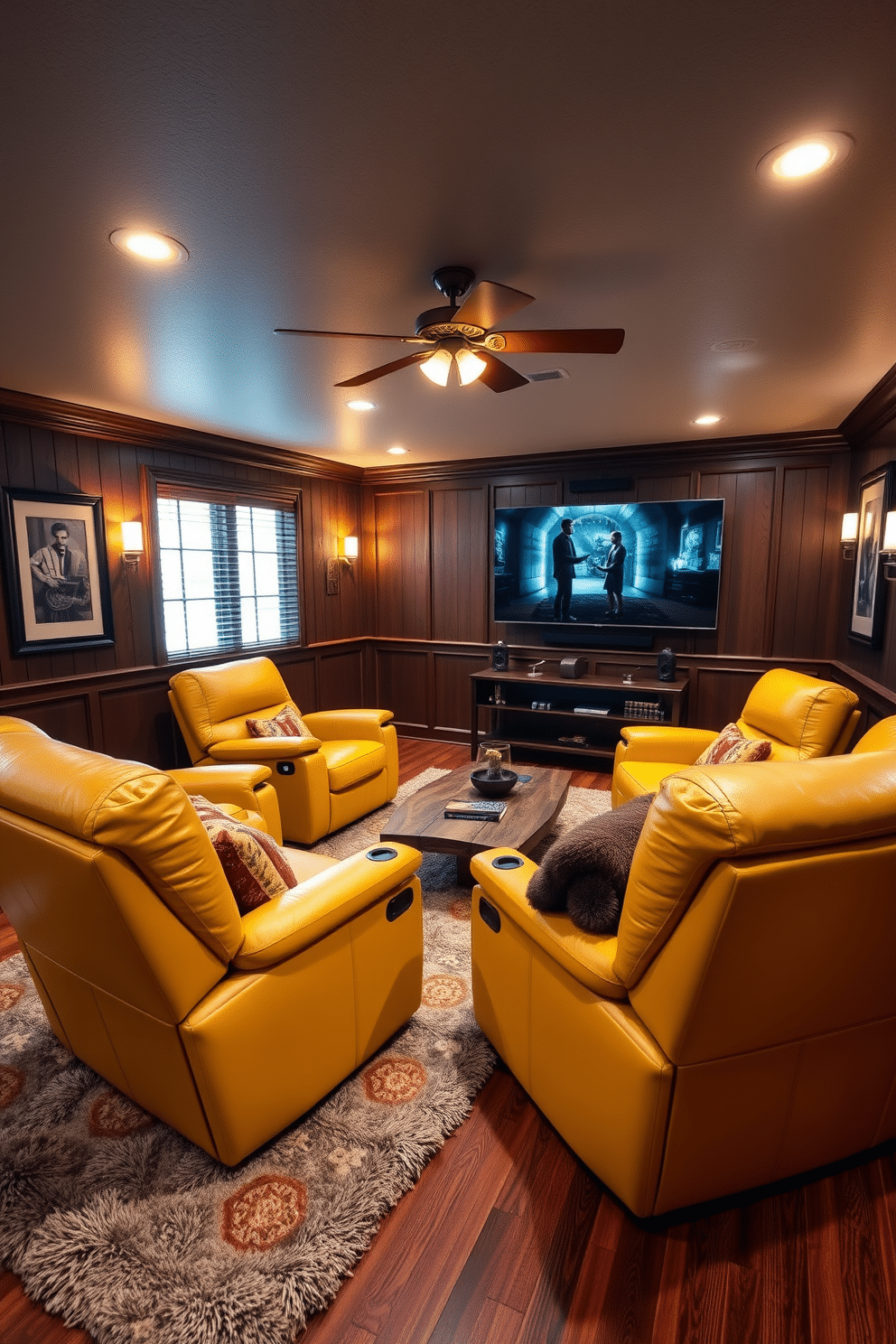A cozy man cave featuring yellow leather recliners that exude both comfort and style. The space is accented with dark wood paneling and ambient lighting to create a relaxed atmosphere.