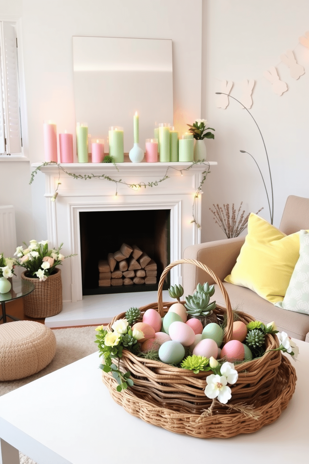 Apartment Easter Decorating Ideas. A cozy apartment living room is adorned with pastel-colored decorations, including a garland of Easter eggs hanging above the fireplace and a centerpiece of fresh spring flowers on the coffee table. Soft, bunny-shaped cushions are placed on the sofa, and a basket filled with painted eggs sits by the window, adding a festive touch to the space.