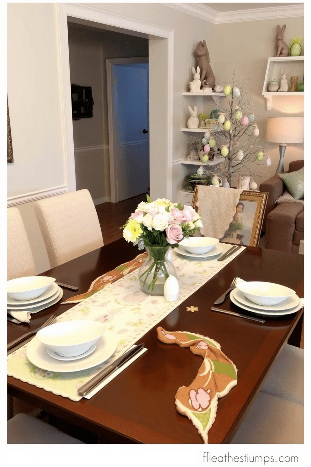 An Easter-themed table runner adorns the dining table, featuring pastel colors and intricate patterns of bunnies, eggs, and flowers. The table is set with matching pastel-colored plates and napkins, complemented by a centerpiece of fresh spring flowers in a clear vase.