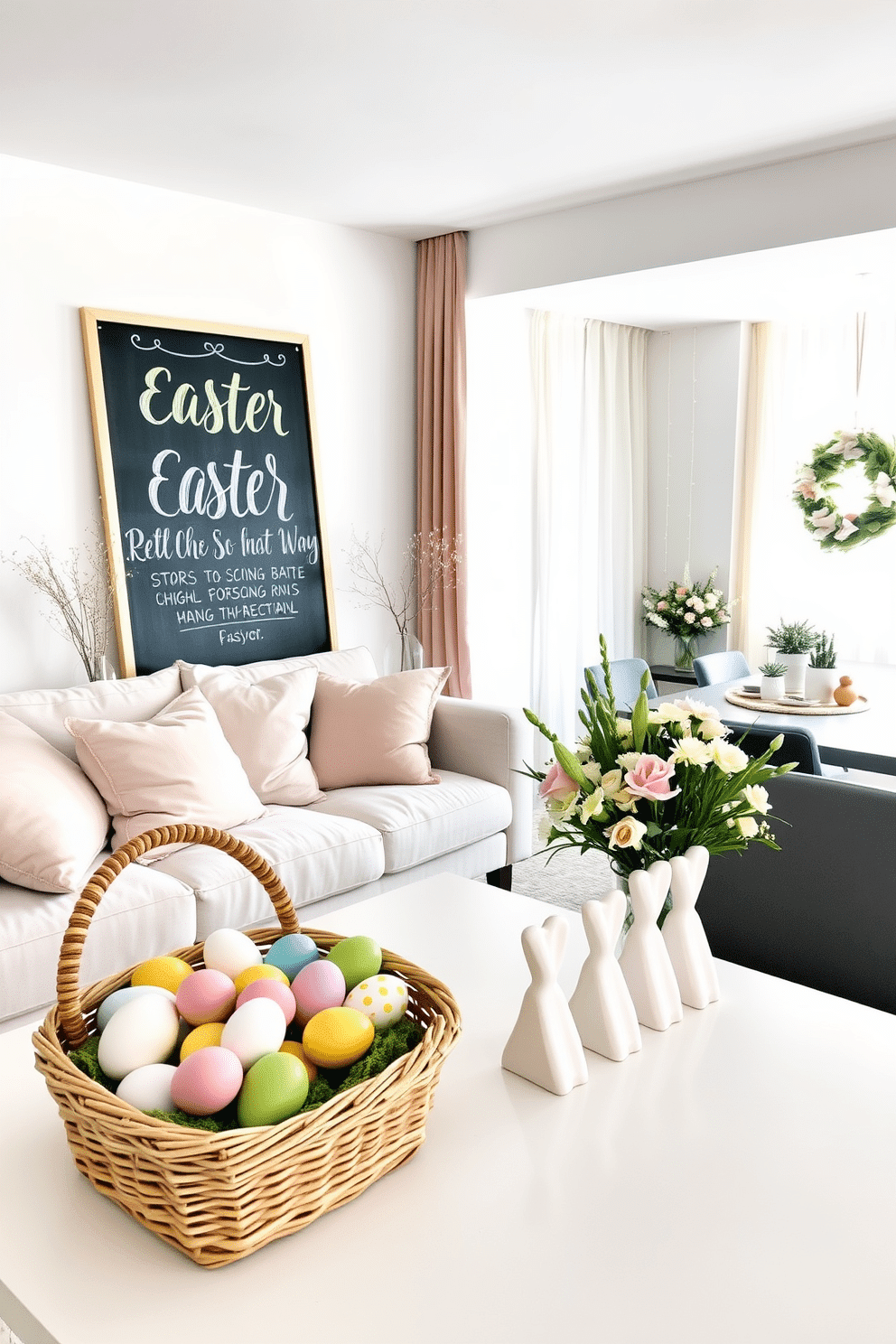 A cozy living room filled with Easter decorations. A large chalkboard stands against one wall, featuring colorful Easter greetings written in elegant, cursive letters with pastel chalk. The room is adorned with soft, pastel-colored cushions on a plush sofa, and a coffee table displays a beautiful arrangement of Easter-themed ornaments. A wicker basket filled with painted eggs sits beside a vase of fresh spring flowers, adding a festive touch to the space.