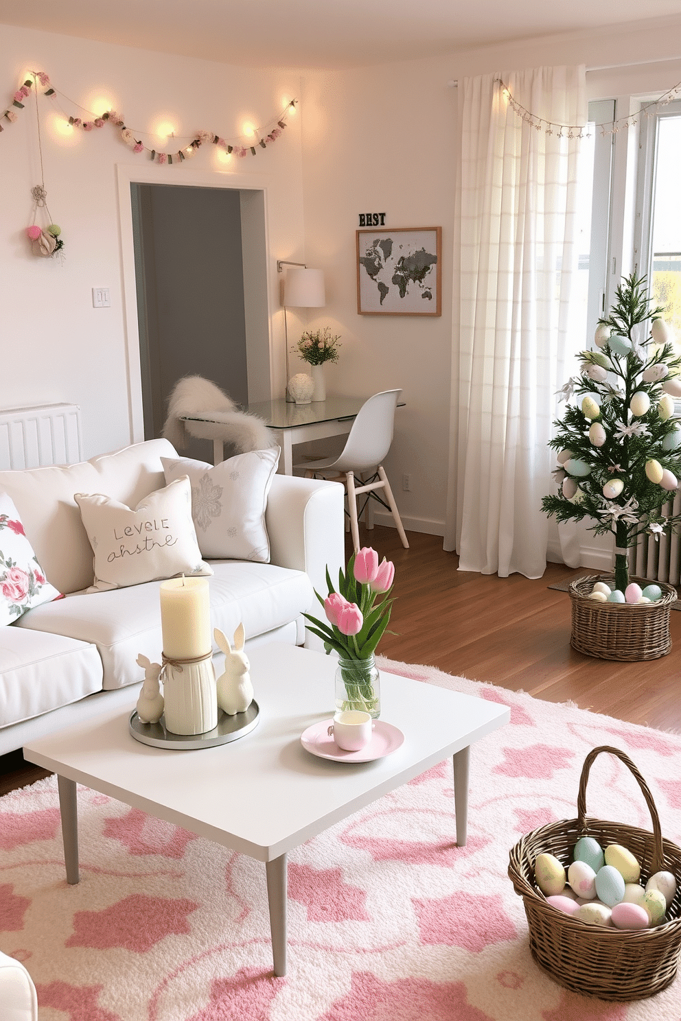 Festive apartment Easter decorating ideas. The living room is brightened with pastel-colored throw pillows and a garland of Easter eggs draped across the mantel. A small Easter tree stands in the corner, adorned with miniature ornaments and lights, while the coffee table showcases a whimsical bunny figurine surrounded by fresh flowers.