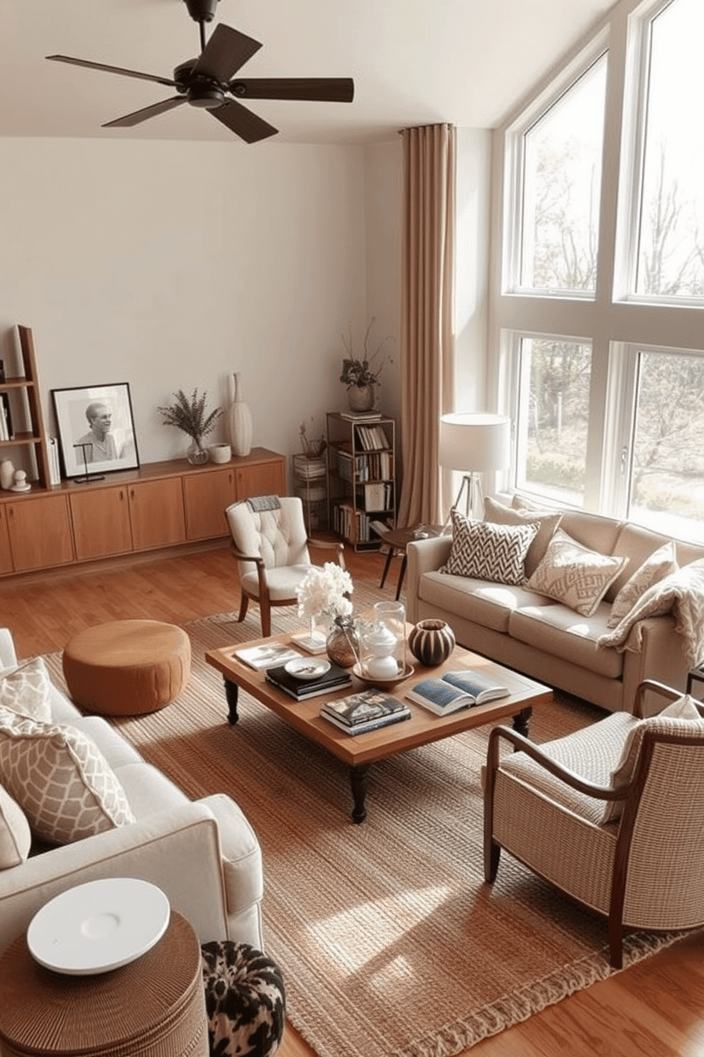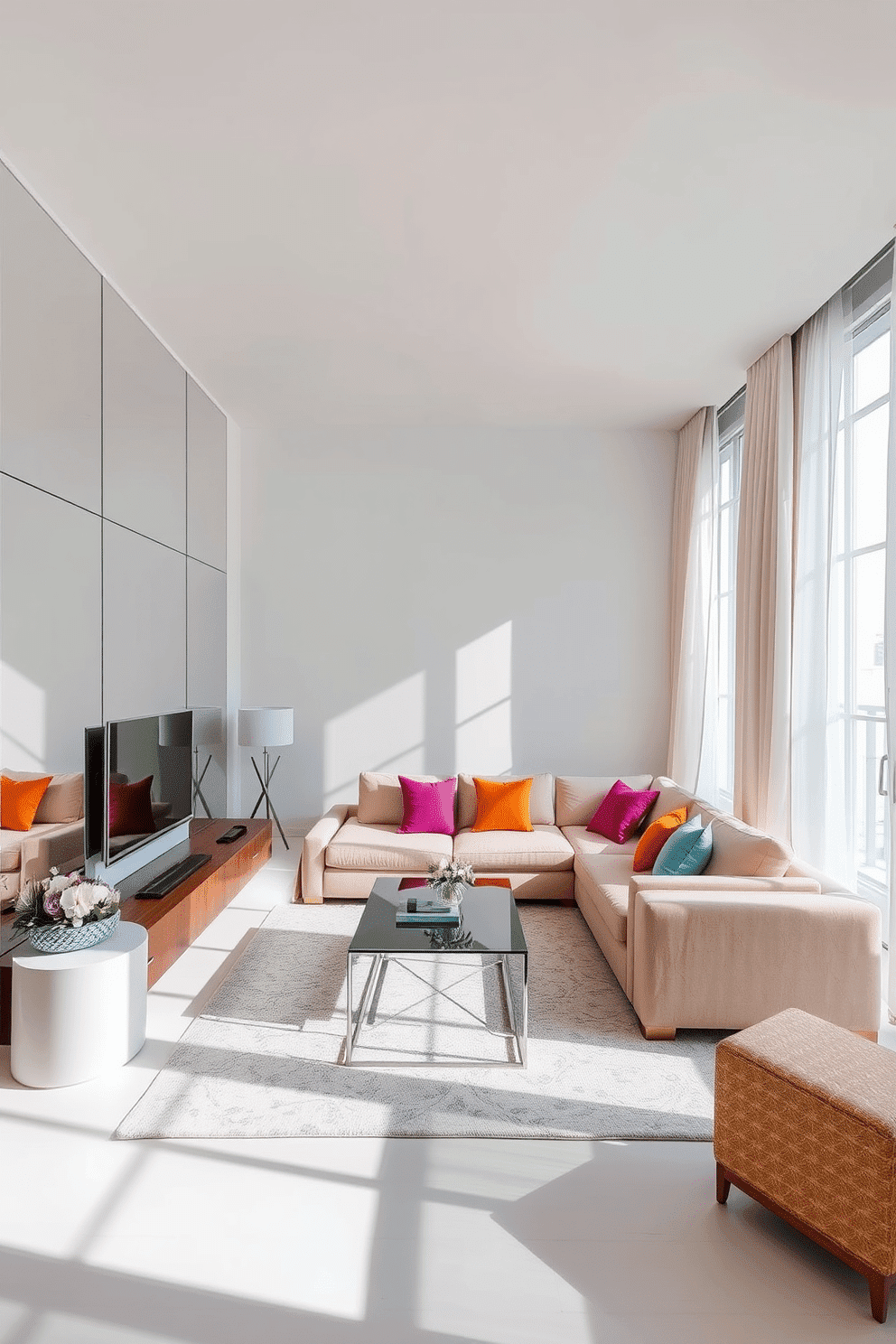 A sleek and stylish apartment living room with a cozy yet modern aesthetic. A mix of mid-century and contemporary furniture fills the area, featuring a gray sectional sofa adorned with vibrant throw pillows, paired with a minimalist wood and metal coffee table.