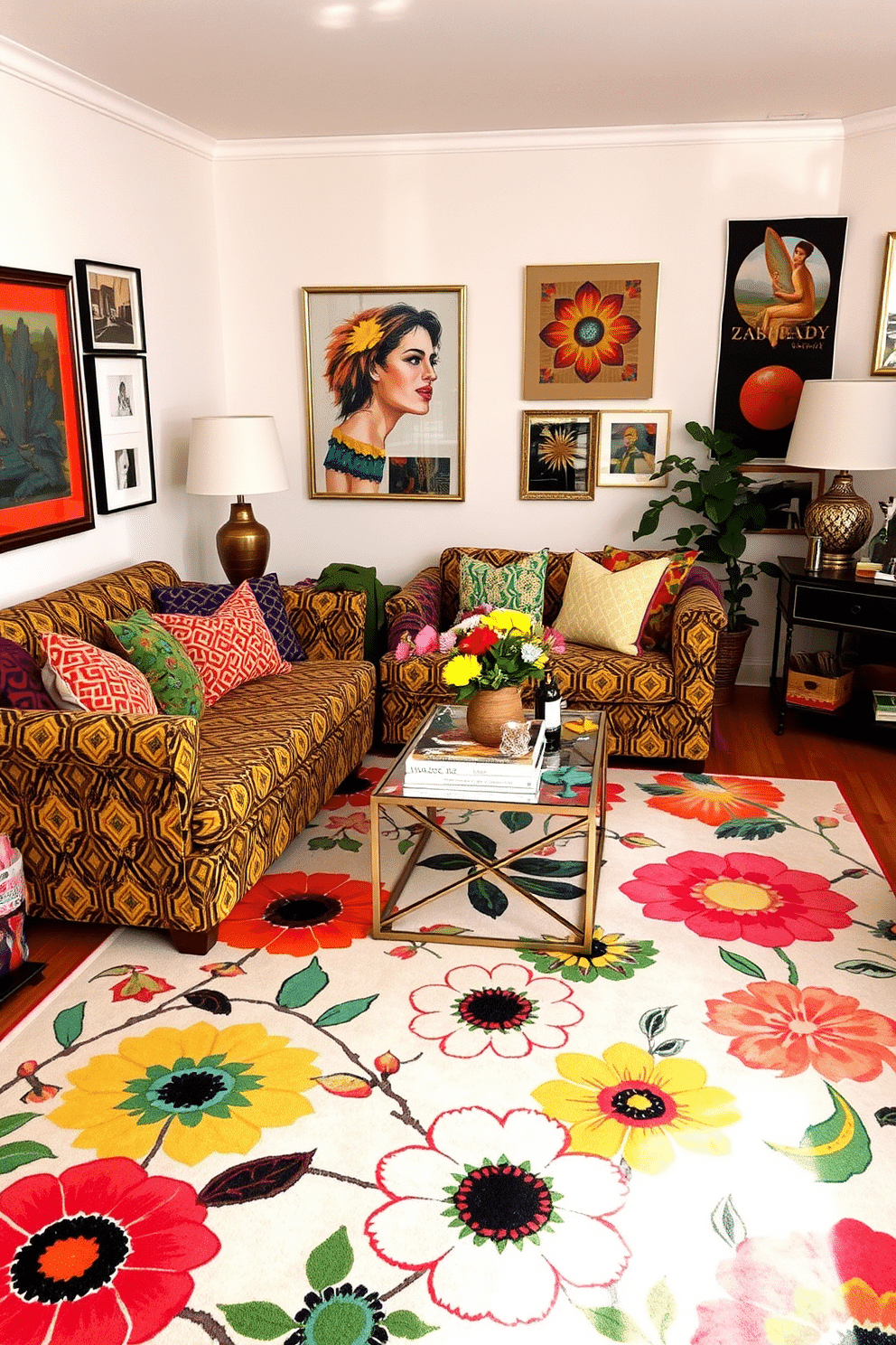 A lively apartment living room exuding retro charm. The space features a mustard yellow sofa with rounded edges, paired with a teakwood coffee table adorned with bold geometric patterns on its surface.