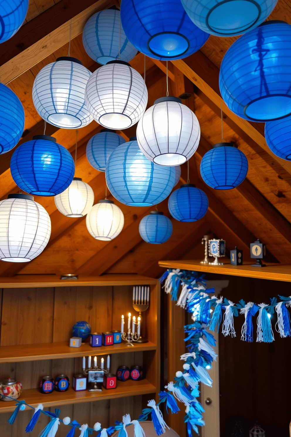 A cozy attic space adorned with blue and white paper lanterns casting a soft glow. The lanterns hang at varying heights, creating a whimsical atmosphere perfect for celebrating Hanukkah.