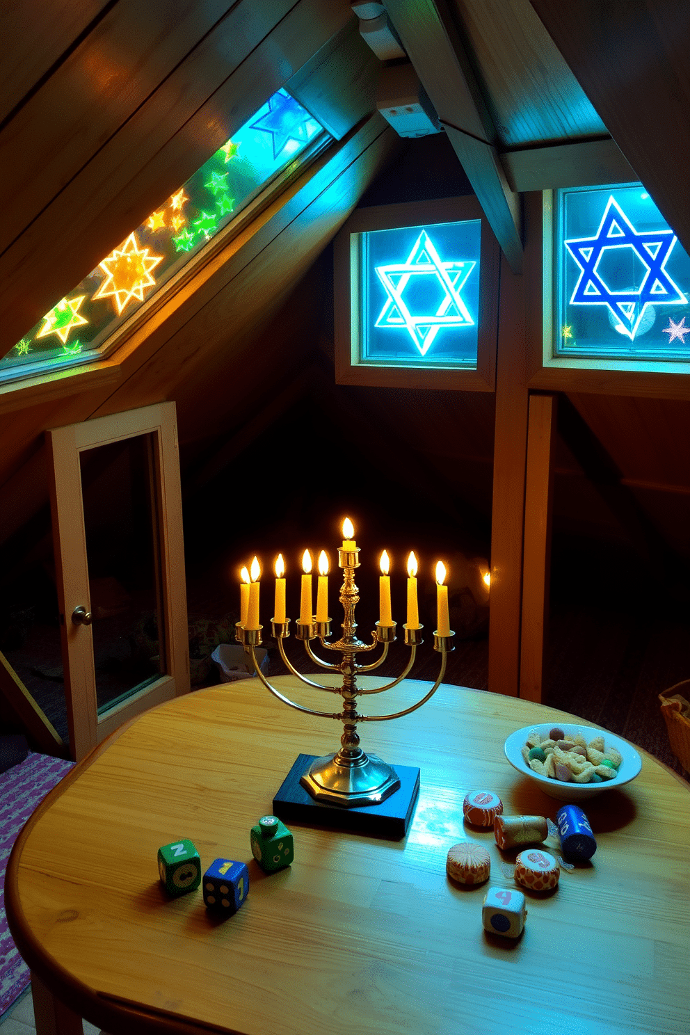 A cozy attic space adorned with festive window decals, showcasing vibrant designs of stars and menorahs that capture the spirit of Hanukkah. Soft, warm lighting illuminates the area, highlighting a beautifully decorated menorah on a wooden table, surrounded by colorful dreidels and traditional treats.
