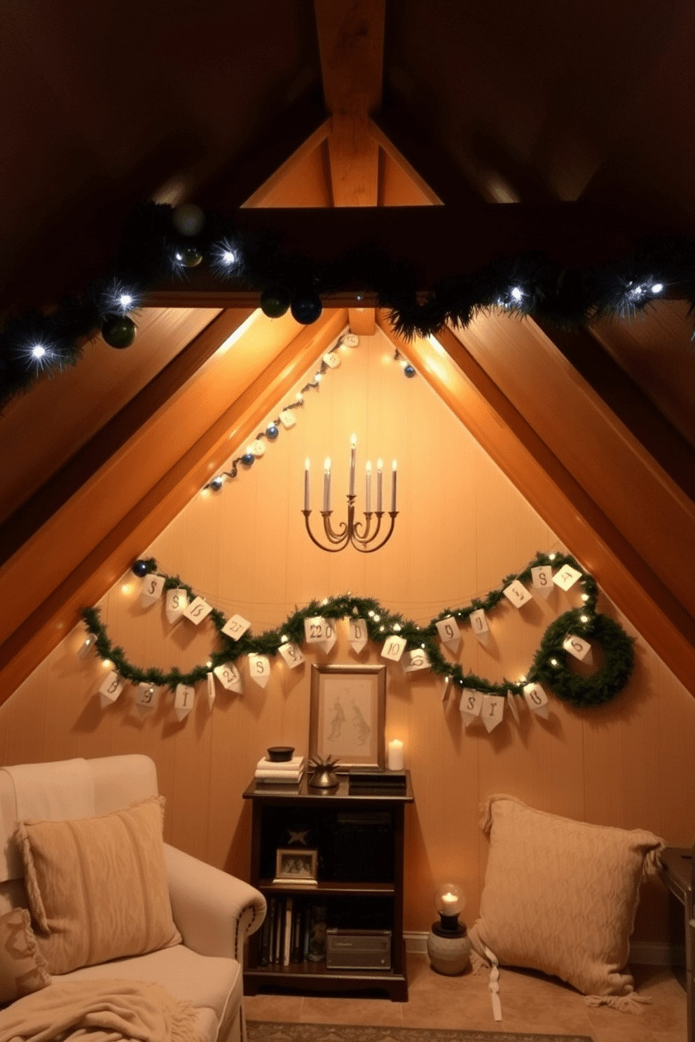 A cozy attic space adorned for Hanukkah, featuring a beautifully crafted menorah hanging from the wooden beams. Soft, warm lighting illuminates the area, highlighting festive garlands of blue and silver that drape across the walls.