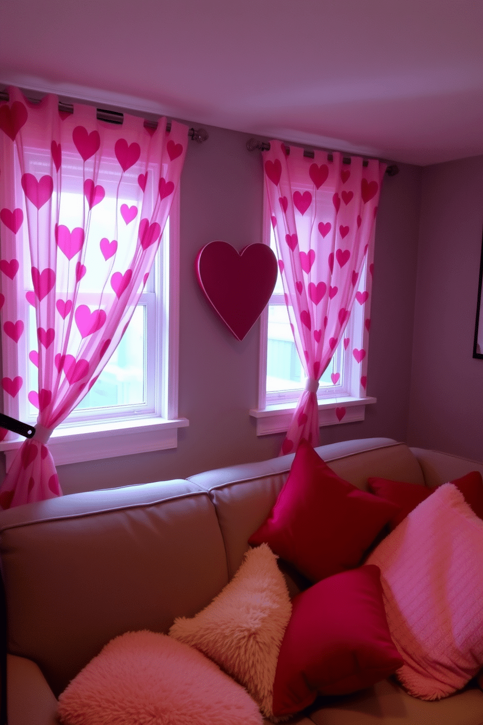 A cozy basement space decorated for Valentine’s Day features heart-patterned curtains that drape elegantly over the windows, adding a touch of romance. Soft, ambient lighting creates a warm atmosphere, while plush cushions in shades of red and pink are scattered across a comfortable sofa, inviting relaxation.