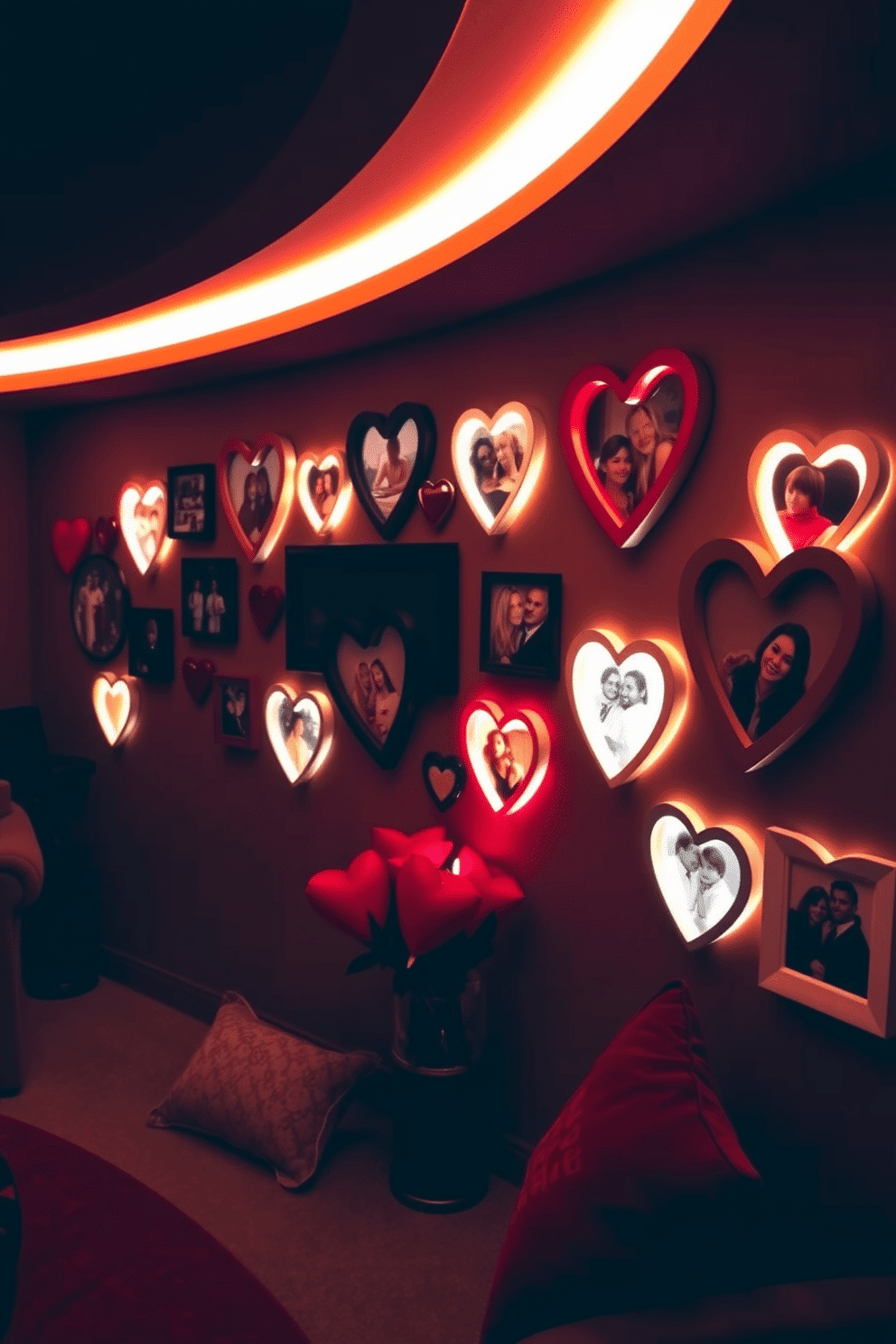 A cozy basement adorned for Valentine’s Day features heart-shaped picture frames displaying cherished memories, arranged in a playful collage on the wall. Soft, ambient lighting casts a warm glow, highlighting the frames against a backdrop of rich, deep colors that evoke romance and intimacy.