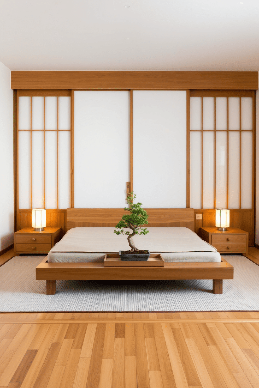 A serene bedroom inspired by Japanese minimalism, featuring low-profile furniture made from warm, natural wood. The bed sits close to the ground with a simple platform frame, flanked by matching low wooden nightstands holding soft paper lantern-style lamps.