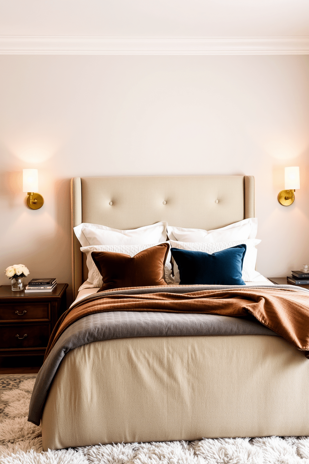 A serene bedroom design ideal for couples, featuring a plush upholstered headboard and a matching bench at the foot of the bed. The bed is adorned with soft, neutral-colored linens, complemented by throw pillows in varying textures and tones for added depth.