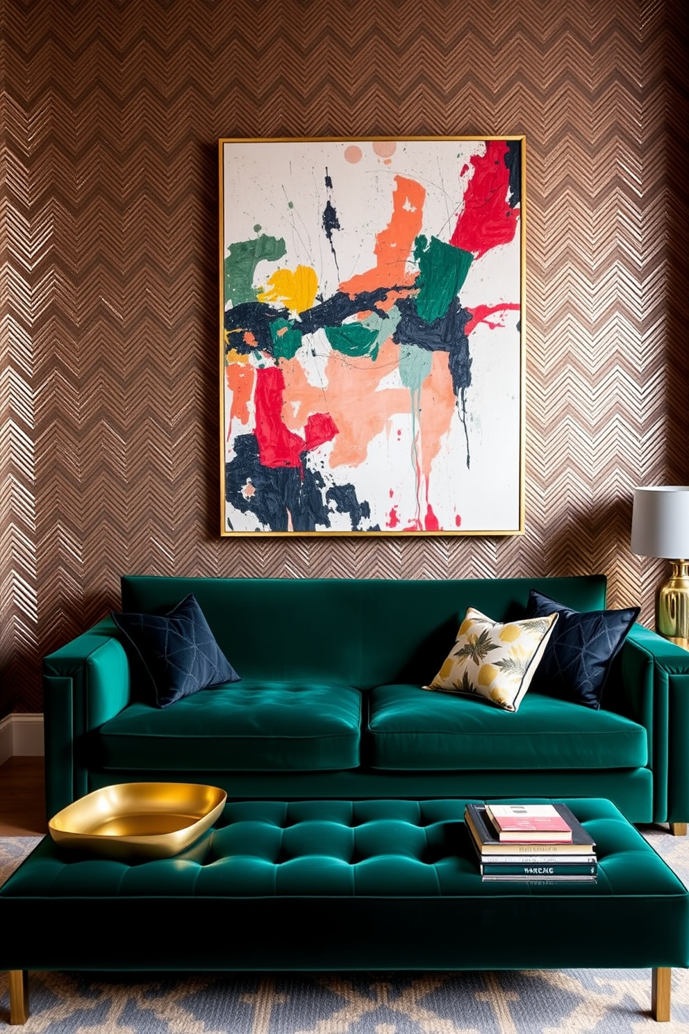 A stylish living room adorned with metallic chevron wallpaper that adds a glamorous touch to the space. The walls shimmer with a subtle sheen, complementing a plush velvet sofa in deep emerald green.