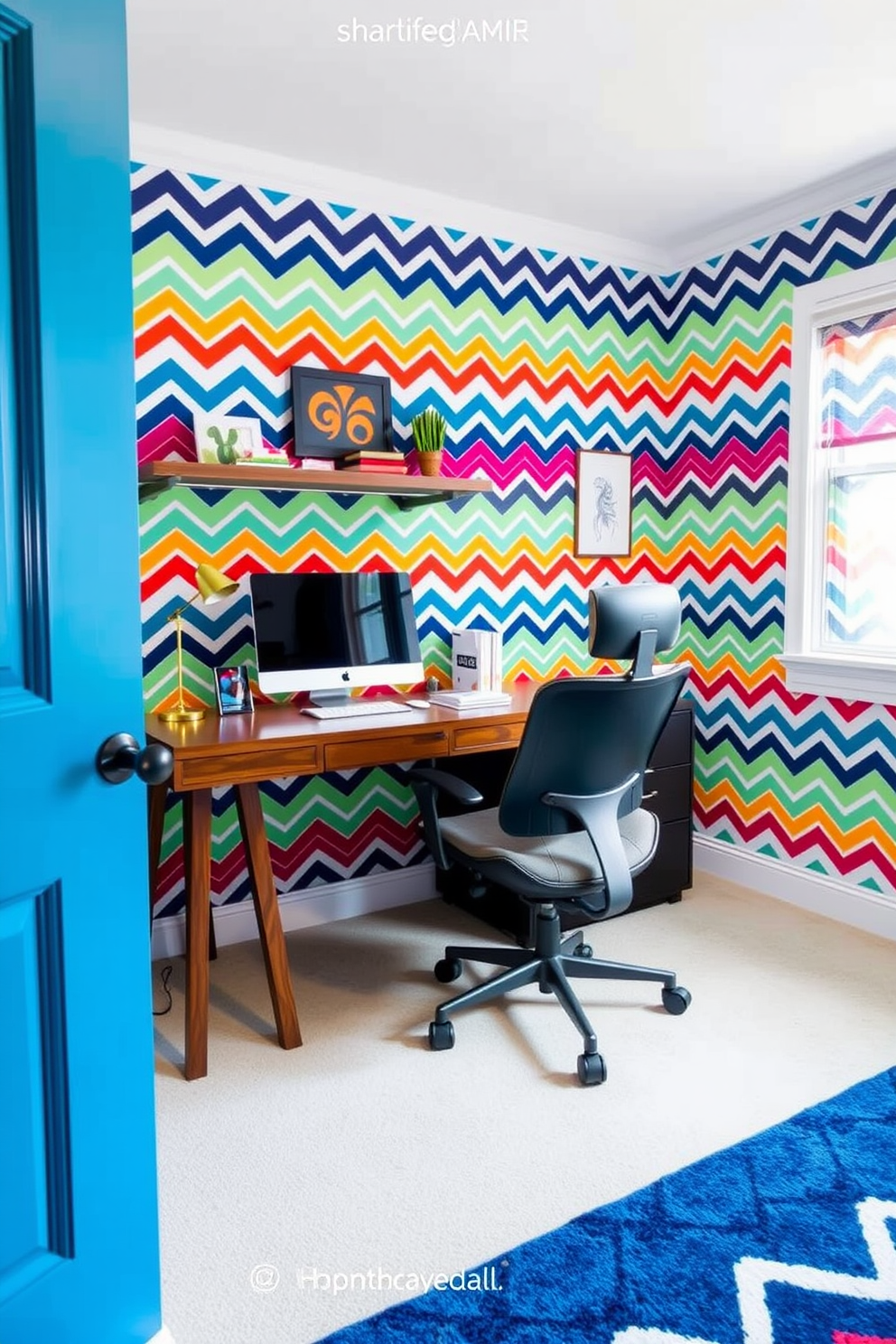 A vibrant home office space adorned with colorful chevron wallpaper that energizes the atmosphere. The room features a sleek wooden desk paired with a comfortable ergonomic chair, creating an inviting workspace.