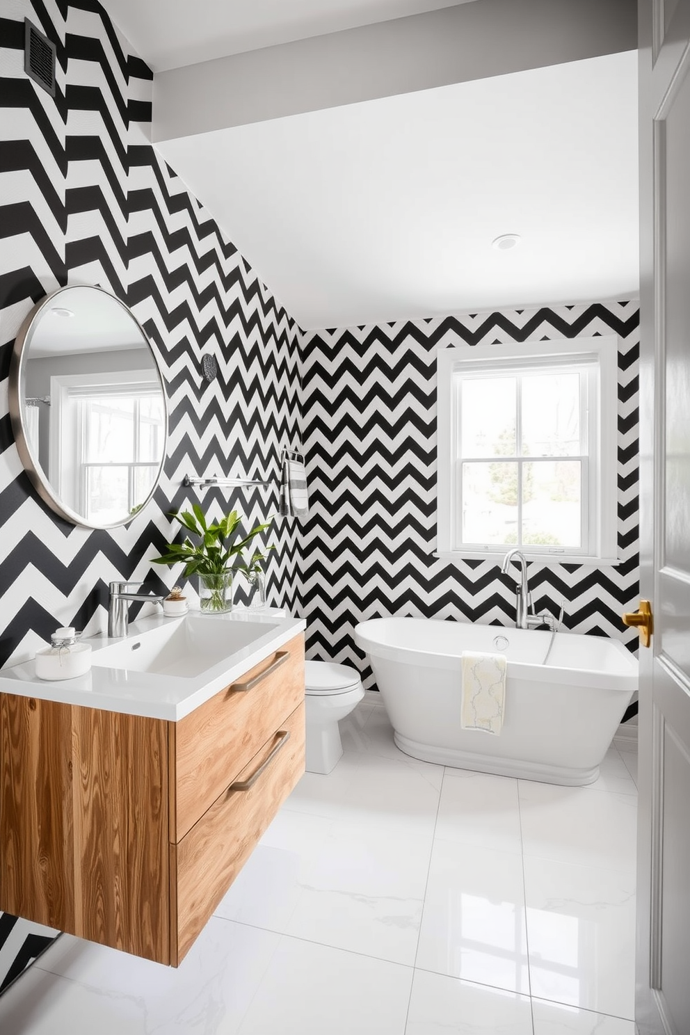 A stylish bathroom featuring chevron wallpaper that creates a bold statement. The walls are adorned with a chic black and white chevron pattern, complemented by sleek modern fixtures and a freestanding bathtub.