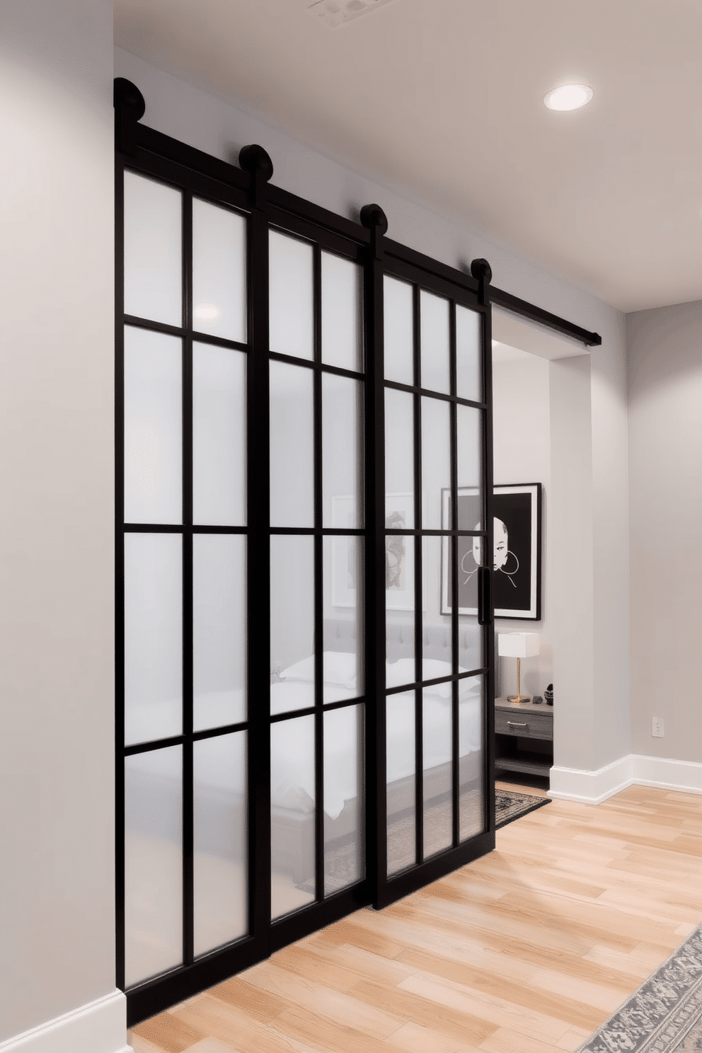 A stylish and modern sliding barn door serves as the focal point of the room, its sleek black metal frame contrasting with frosted glass panels for a contemporary vibe. The soft gray walls and light wood flooring enhance the room’s ambiance, while recessed lighting highlights the door’s refined craftsmanship.