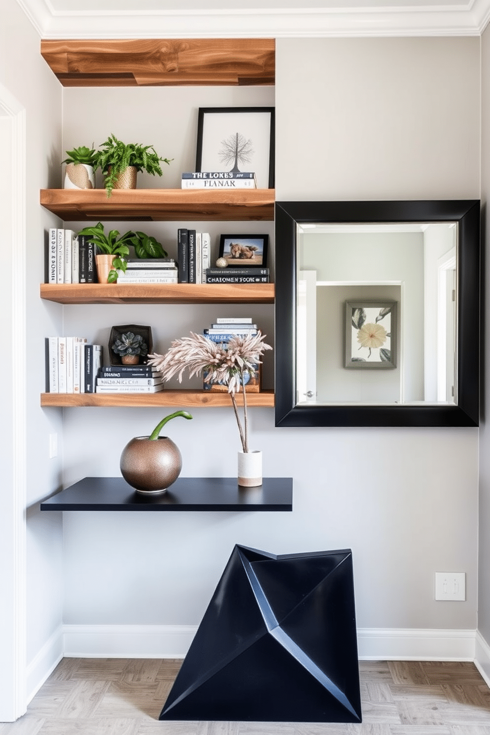 A sleek console table made of dark wood is positioned against the wall, topped with a decorative bowl and a small potted plant. Above it hangs a large geometric mirror that reflects the light, creating an illusion of space and adding a modern touch to the foyer.