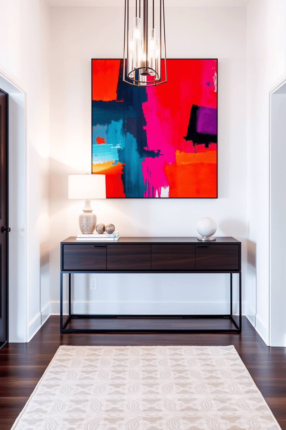 A contemporary foyer featuring a striking piece of artwork with vibrant colors that draws the eye upon entry. The walls are painted in a soft white, providing a clean backdrop for the bold hues of the artwork, while a sleek console table in a dark wood adds sophistication.