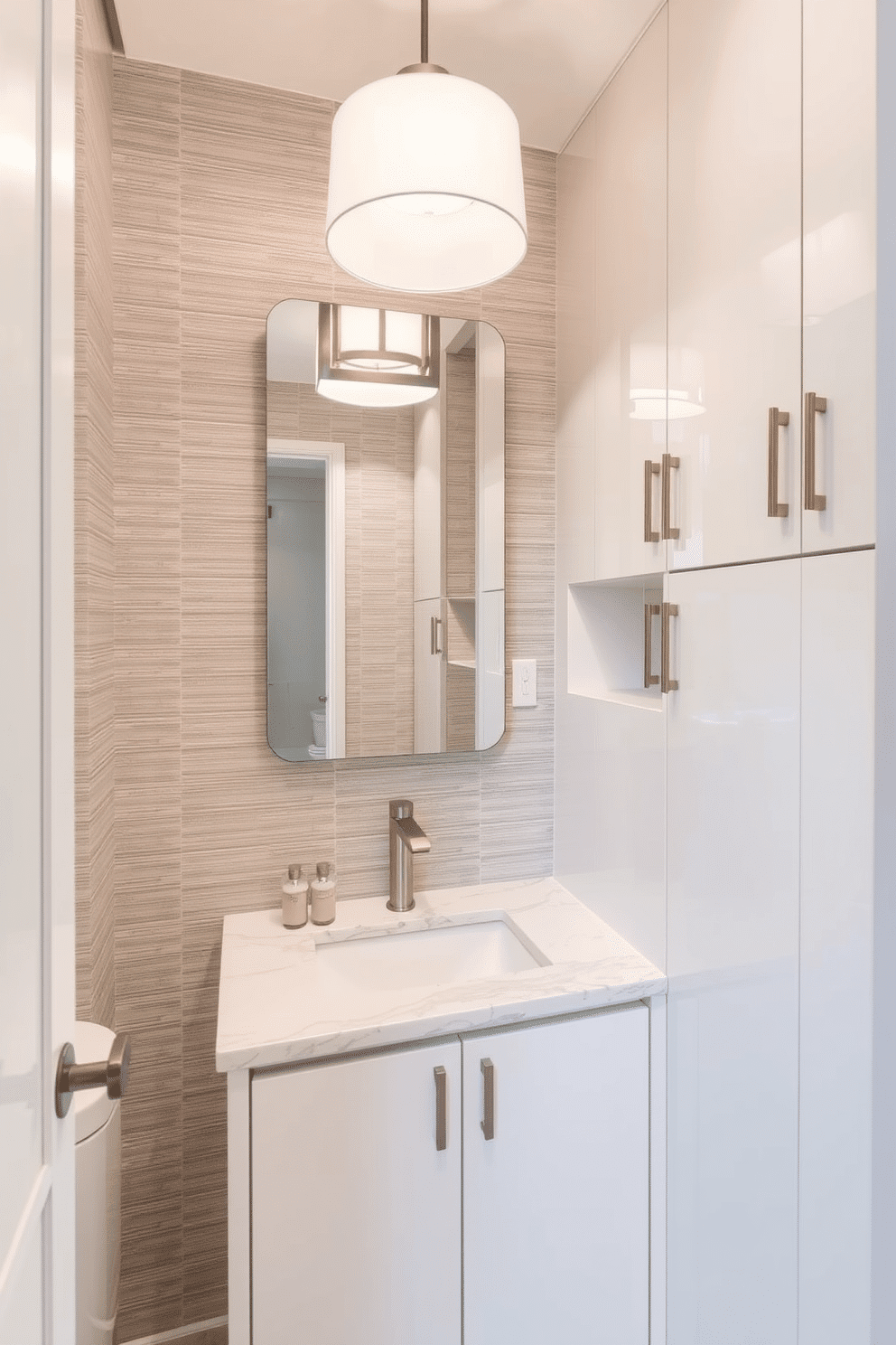 A sleek contemporary powder room features custom cabinetry that maximizes space and offers tailored storage solutions. The cabinetry is finished in a high-gloss white, complementing the elegant marble countertop and modern fixtures.