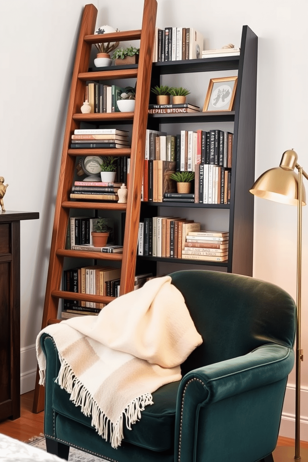 A cozy bedroom reading nook featuring a vintage wooden ladder bookshelf. The shelves are filled with a mix of books, small potted plants, and decorative trinkets, adding a charming touch of nostalgia to the space.