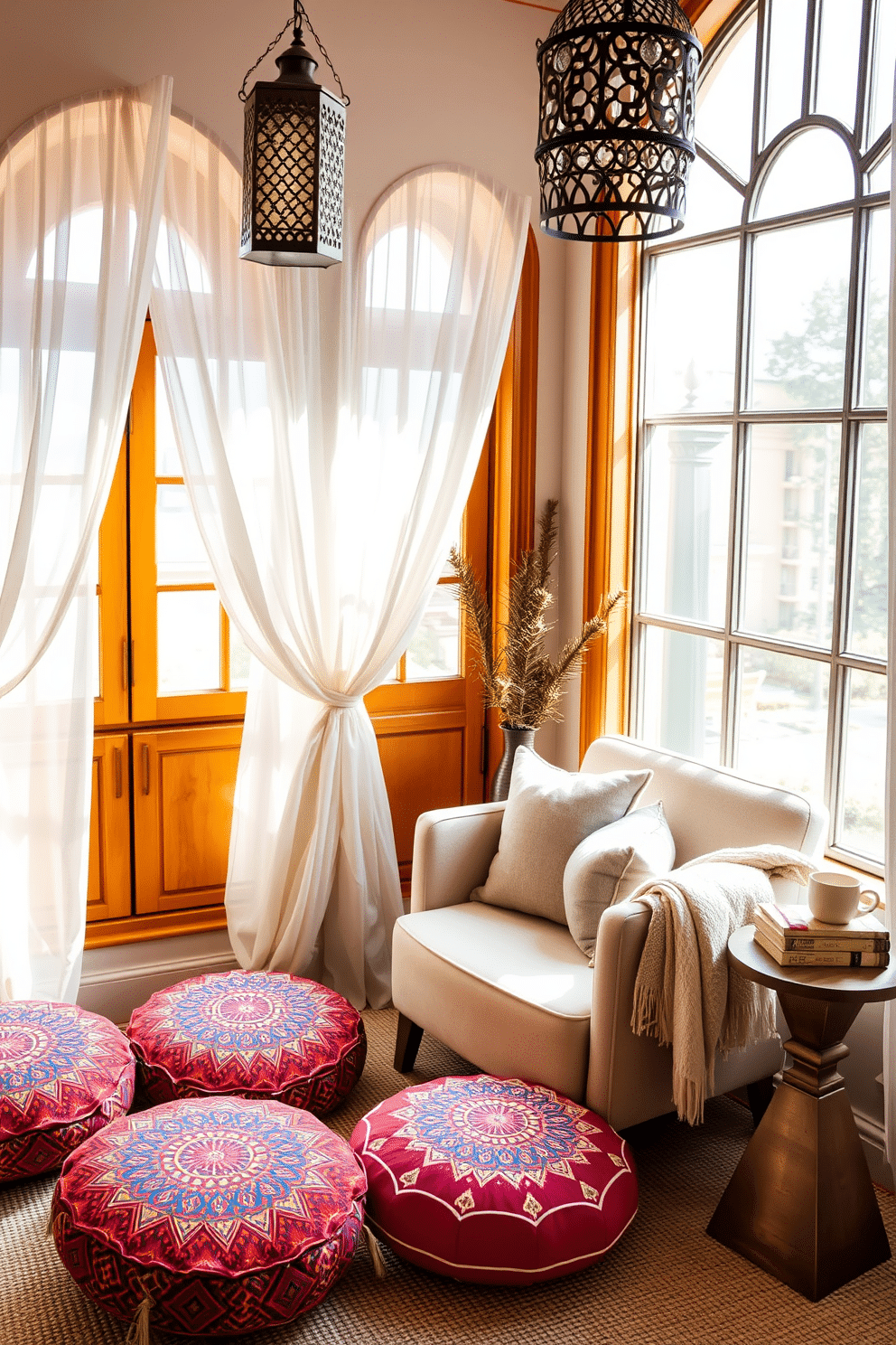 A cozy Moroccan-style nook adorned with vibrant, patterned floor poufs in shades of red, orange, and blue, arranged over a natural jute rug. The space features arched windows with warm wooden frames, sheer white curtains, and intricate lanterns casting soft, ambient light.